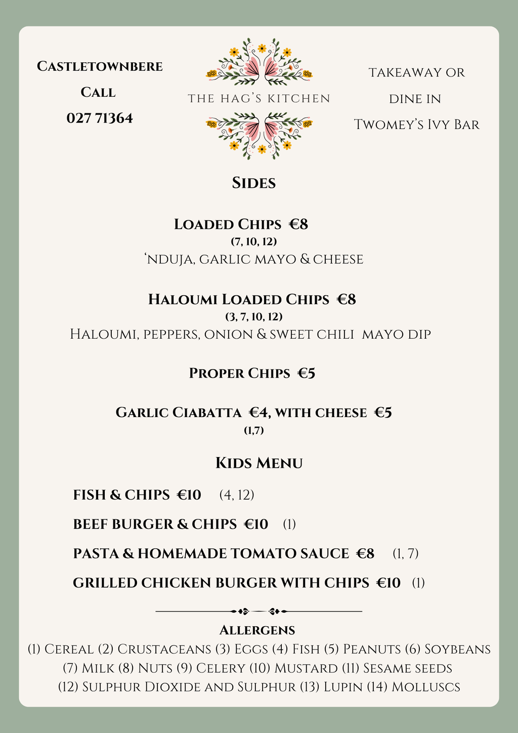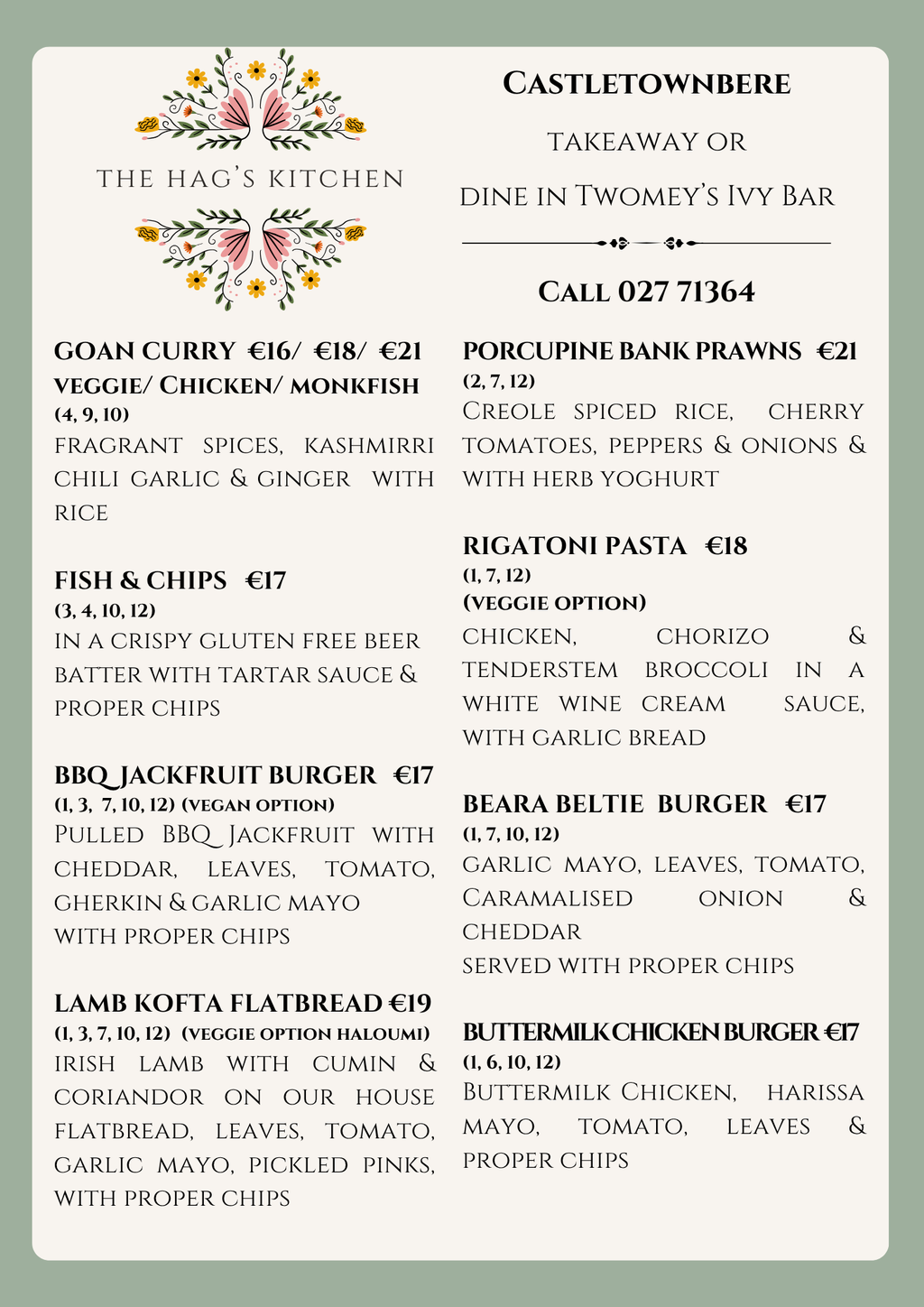 Call 027 71364 or pop in to the shop to order for takeaway or to dine in Twomey's Bar