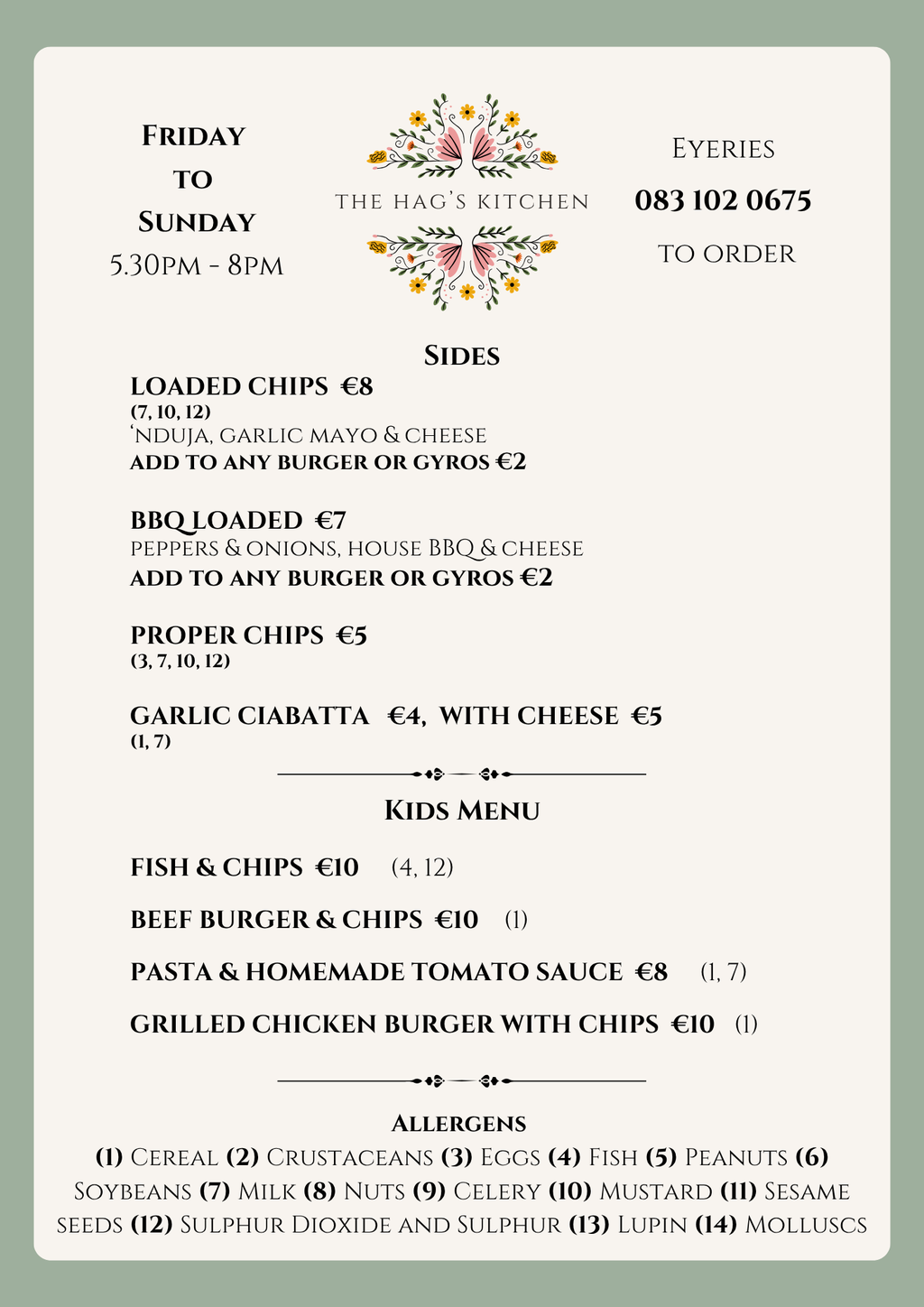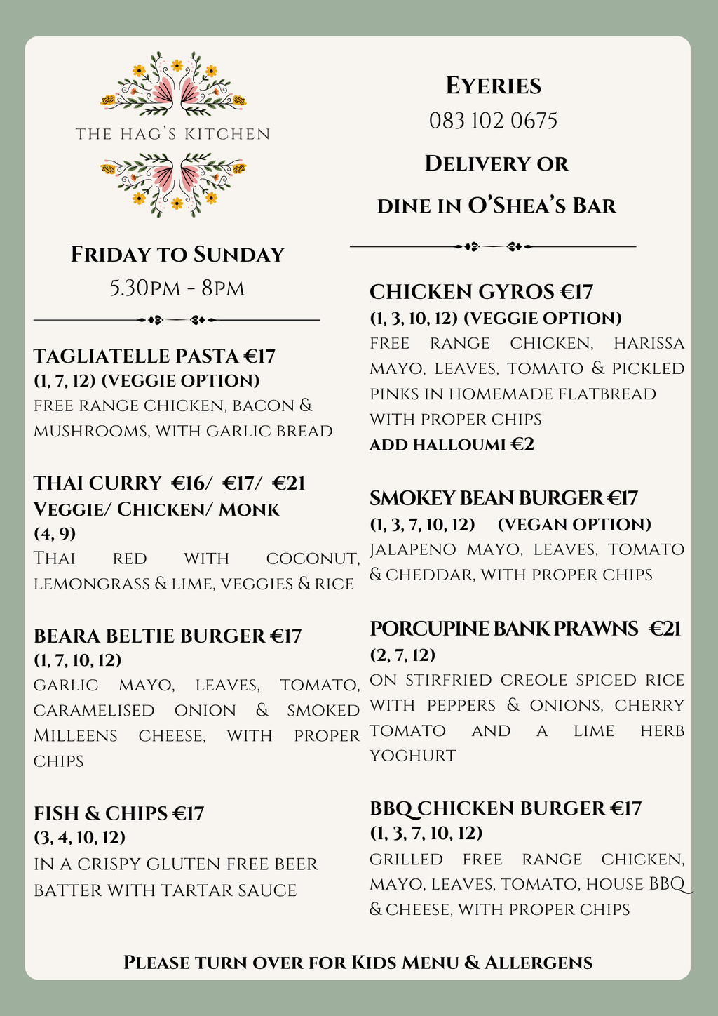 Here you can find the menu for our delivery service available within the Eyeries area including at O'Sheas Bar where you can enjoy a drink with your meal.